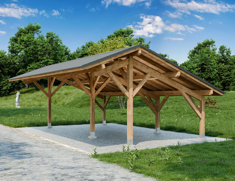 Ein hochwertiger Carport für drei Fahrzeuge, gefertigt aus stabilen, getrockneten BSH-Bauholzträgern. Die massive Konstruktion bietet sicheren Schutz für Ihre Autos und schafft zusätzlichen Platz für Gartengeräte, Werkzeug oder Brennholz. BSH-Holz garantiert eine außergewöhnliche Stabilität und lange Lebensdauer – perfekt für alle, die auf Qualität setzen.