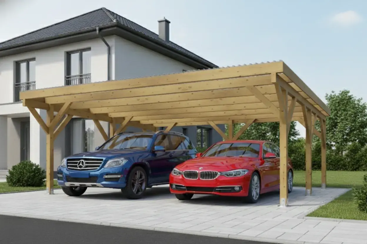 Moderner Carport aus robustem BSH-Holz, ideal für zwei Fahrzeuge. Die massive Konstruktion schützt Ihre Autos zuverlässig vor Witterungseinflüssen und verleiht Ihrer Einfahrt einen gepflegten, eleganten Look.