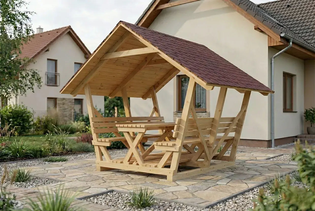 Gartenlaube Salas 190x340 inklusive Möbel kann als Gebrauchsgegenstand verwendet werden, dient aber in erster Linie der erholsamen Gartenbelebung. Im Lieferumfang sind Befestigungsmittel und eine Montageanleitung enthalten, um den Aufbau der Konstruktion zu erleichtern. Tragende Säulen des Pavillons 7,5x12 cm (abgerundete Kanten). Die Druckimprägnierung des Holzes erfolgt ökologisch und qualitativ mit einem chromfreien Produkt TANALITH® E. Nach der Montage kann es mit optionalen Farben gestrichen werden.