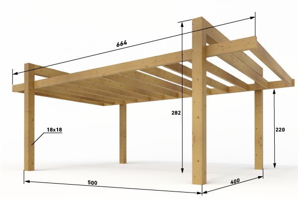 | Maße & Konstruktion | ● Sparren - 5,6x18 cm BSH ● Pfette (Mauerlatte) - 18x18 cm BSH |
