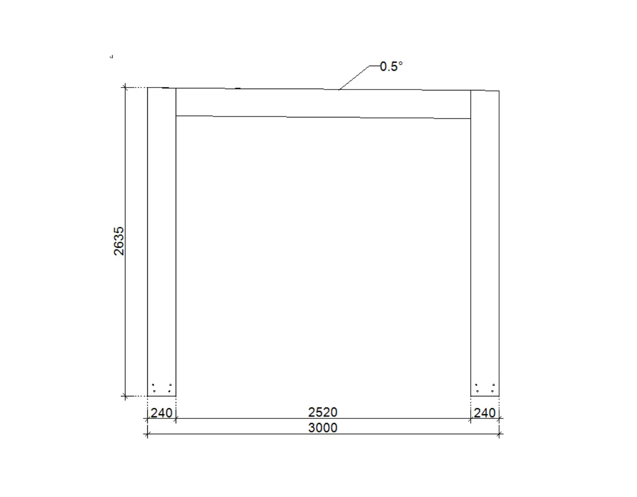 | Maße & Konstruktion | ● Sparren - 8x16 cm BSH ● Durchgangshöhe: 240 cm ● Gesamthöhe: 265 cm ● Dachneigung: 0,5⁰ |