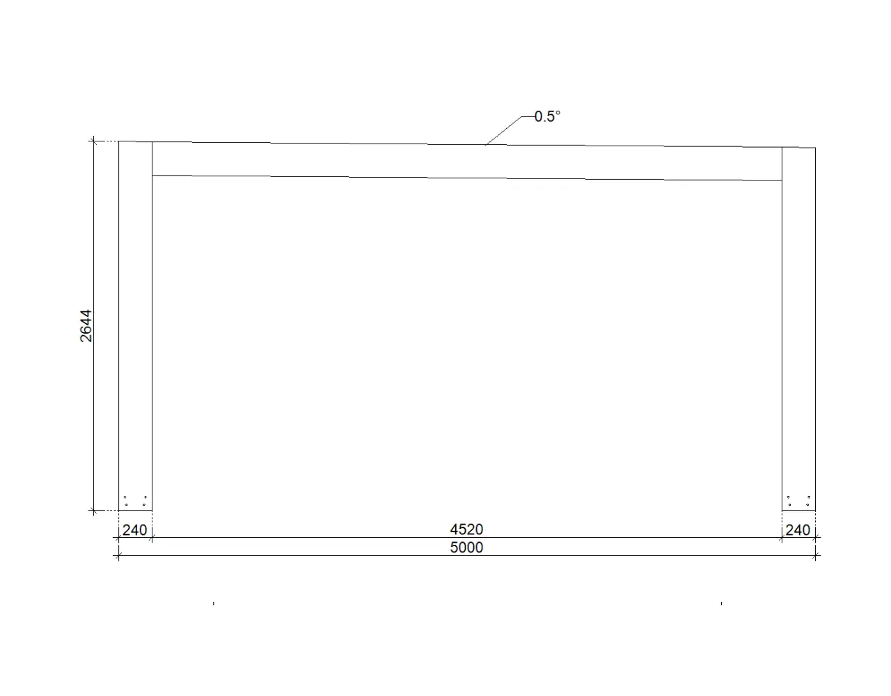 | Maße & Konstruktion | ● Pfette (Mauerlatte) - 12x24 cm BSH ● Sparren - 8x16 cm BSH ● Durchgangshöhe: 240 cm ● Gesamthöhe: 265 cm ● Dachneigung: 0,5⁰ |