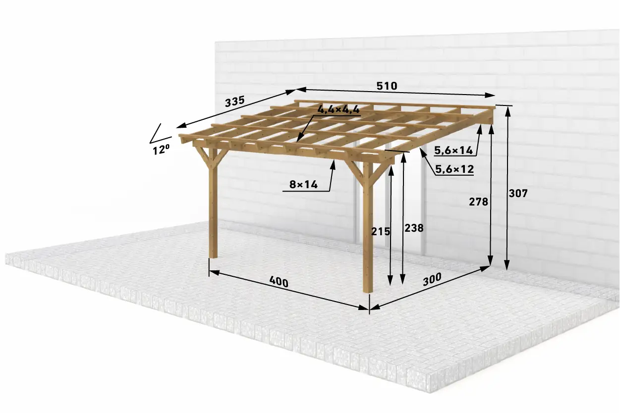 | Zusätzliche Maße | ● Sparren: 5,6x12 cm (BSH) ● Pfette (Mauerlatte): 8x14 cm (BSH) ● Dachlatten: 4,4x4,4 cm |