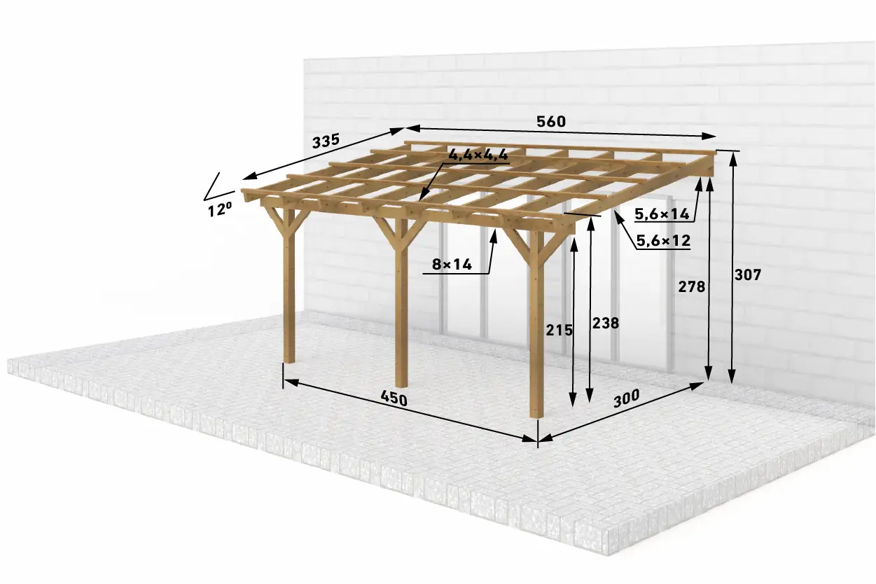 | Zusätzliche Maße | ● Sparren: 5,6x12 cm (BSH) ● Pfette (Mauerlatte): 8x14 cm (BSH) ● Dachlatten: 4,4x4,4 cm |