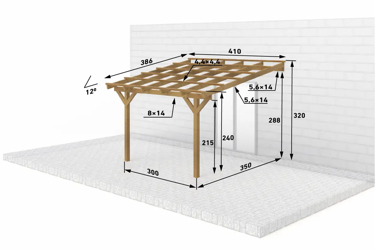 | Zusätzliche Maße | ● Sparren: 5,6x14 cm (BSH) ● Pfette (Mauerlatte): 8x14 cm (BSH) ● Dachlatten: 4,4x4,4 cm |