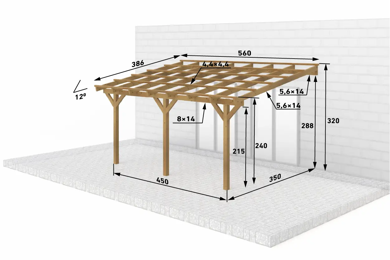 | Zusätzliche Maße | ● Sparren: 5,6x14 cm (BSH) ● Pfette (Mauerlatte): 8x14 cm (BSH) ● Dachlatten: 4,4x4,4 cm |