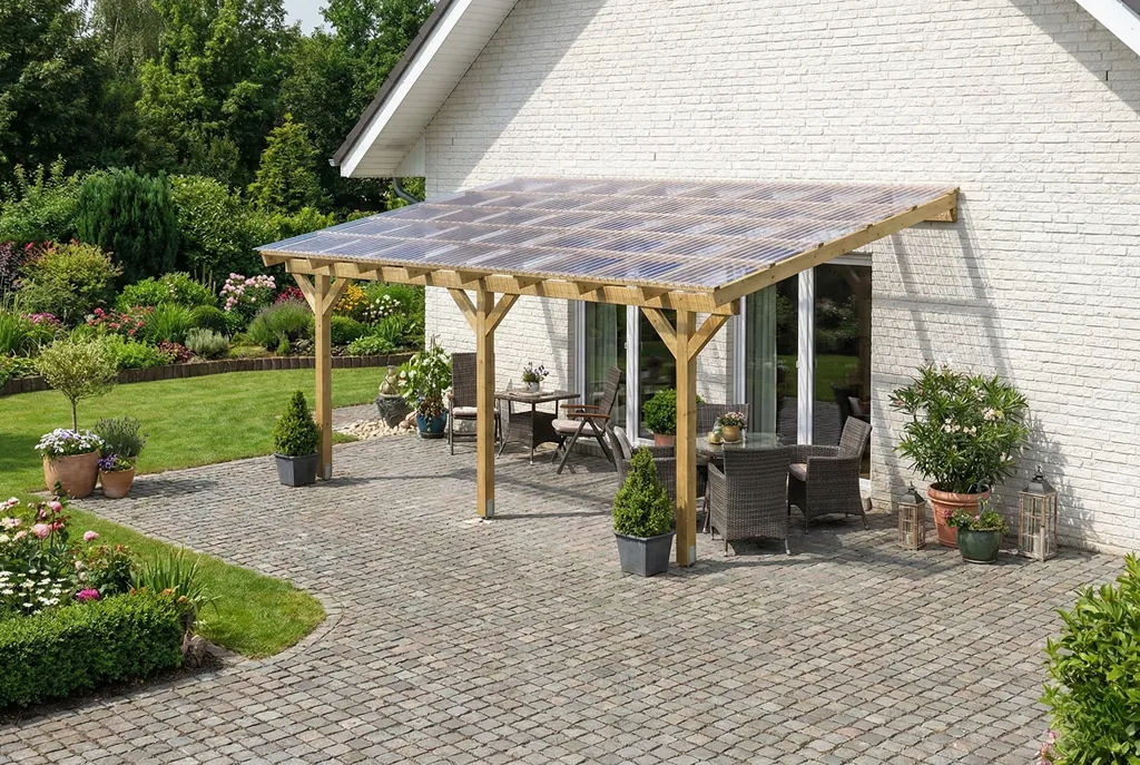 Unsere Pergola ist die ideale Lösung, wenn Sie ein stabiles und elegantes Terrassendach suchen. Am besten eignet sich eine Überdachung aus transparenten Stegplatten (Polycarbonat), Sie können jedoch auch beliebige Well- oder Trapezplatten verwenden – ganz nach Ihrem Geschmack.