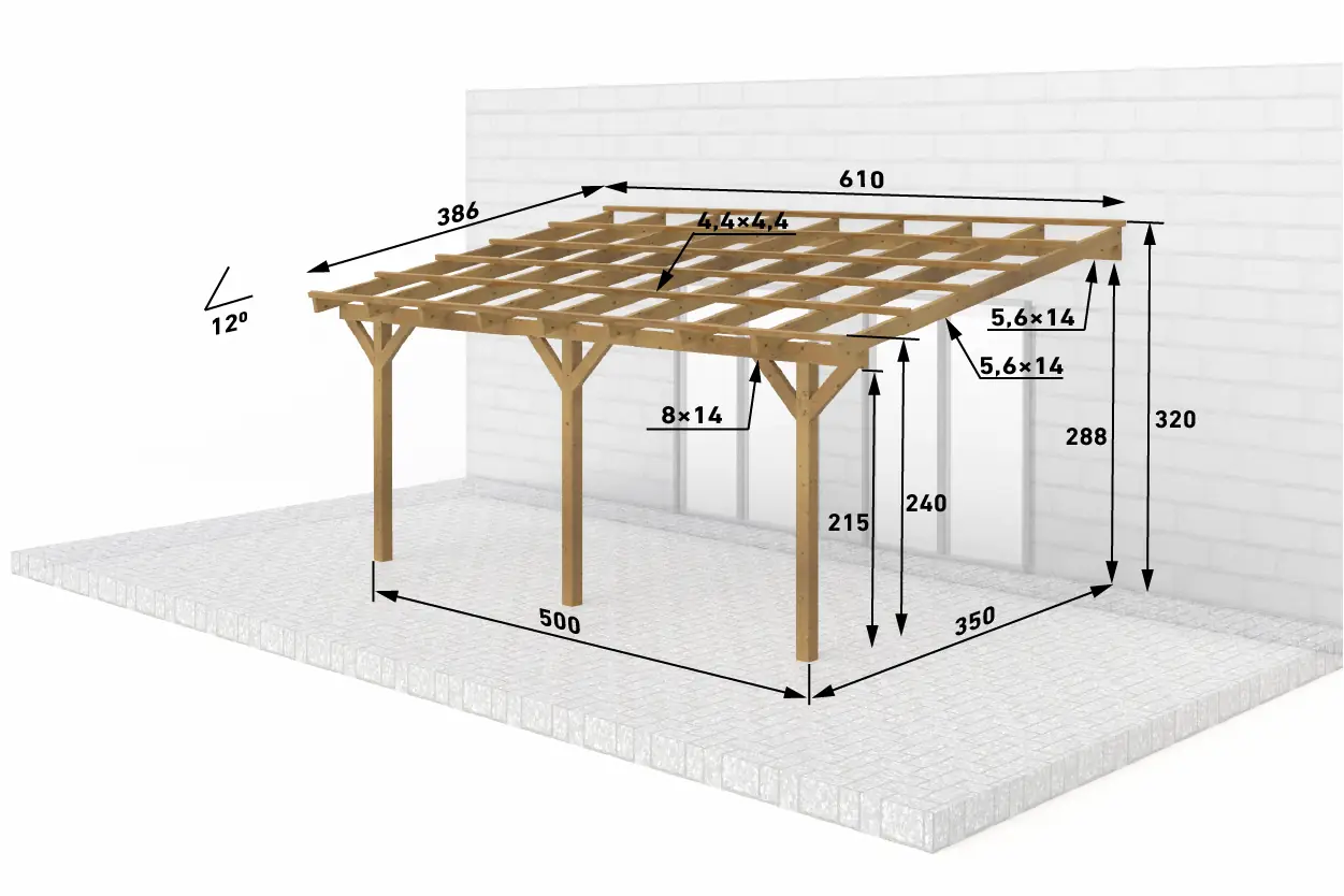 | Zusätzliche Maße | ● Sparren: 5,6x14 cm (BSH) ● Pfette (Mauerlatte): 8x14 cm (BSH) ● Dachlatten: 4,4x4,4 cm |