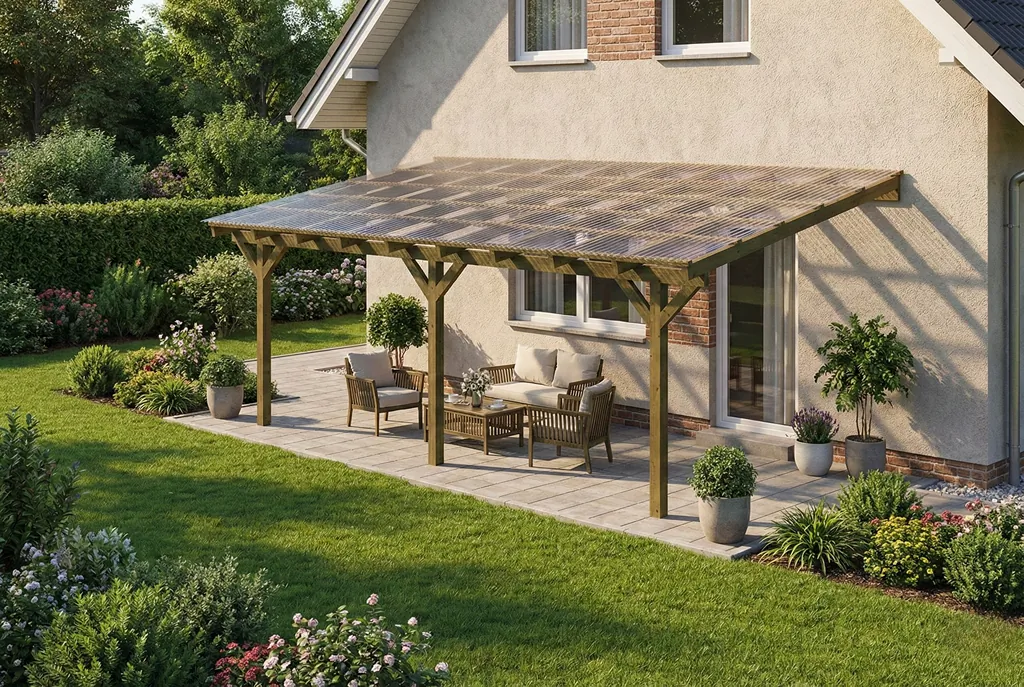 Unsere Pergola ist die ideale Lösung, wenn Sie ein stabiles und elegantes Terrassendach suchen. Am besten eignet sich eine Überdachung aus transparenten Stegplatten (Polycarbonat), Sie können jedoch auch beliebige Well- oder Trapezplatten verwenden – ganz nach Ihrem Geschmack.