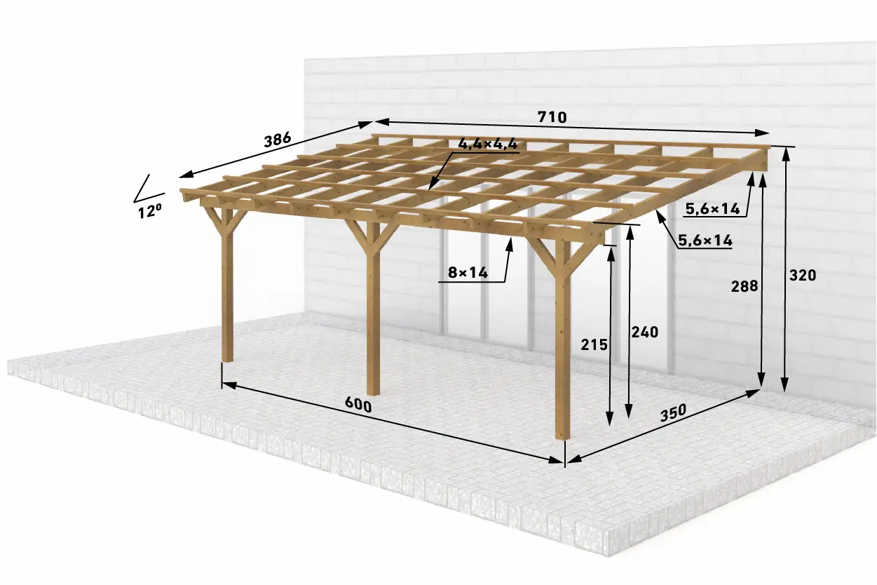 | Zusätzliche Maße | ● Sparren: 5,6x14 cm (BSH) ● Pfette (Mauerlatte): 8x14 cm (BSH) ● Dachlatten: 4,4x4,4 cm |