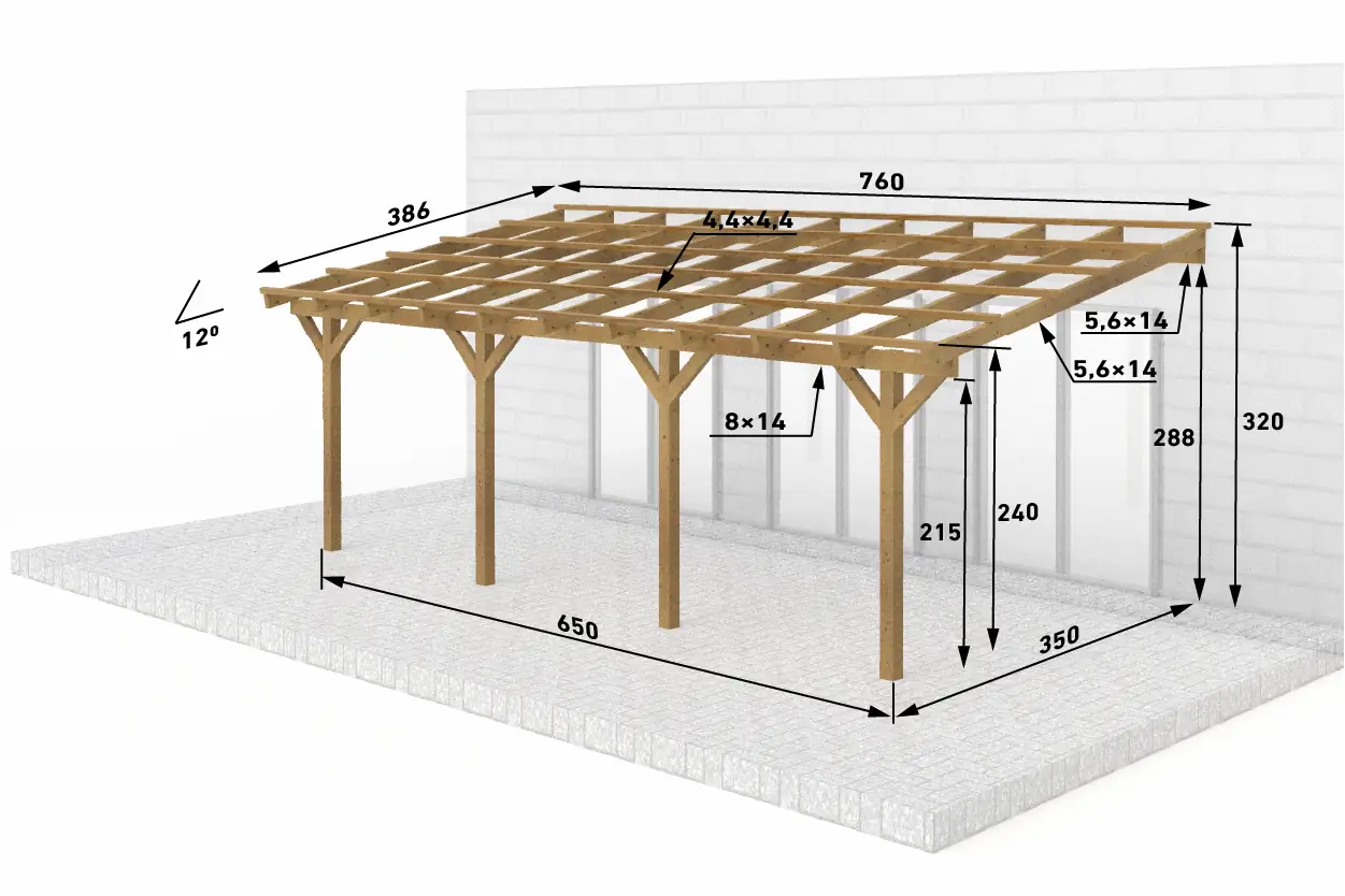 | Zusätzliche Maße | ● Sparren: 5,6x14 cm (BSH) ● Pfette (Mauerlatte): 8x14 cm (BSH) ● Dachlatten: 4,4x4,4 cm |