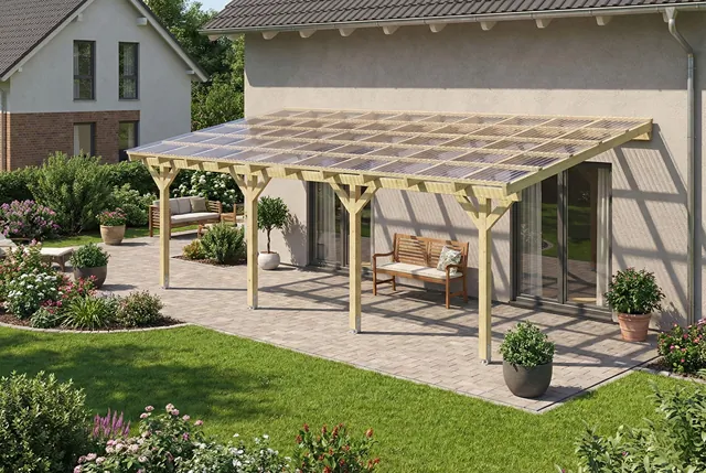 Unsere Pergola ist die ideale Lösung, wenn Sie ein stabiles und elegantes Terrassendach suchen. Am besten eignet sich eine Überdachung aus transparenten Stegplatten (Polycarbonat), Sie können jedoch auch beliebige Well- oder Trapezplatten verwenden – ganz nach Ihrem Geschmack.