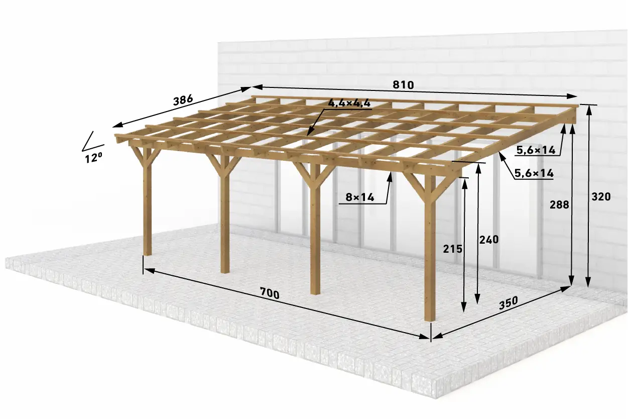 | Zusätzliche Maße | ● Sparren: 5,6x14 cm (BSH) ● Pfette (Mauerlatte): 8x14 cm (BSH) ● Dachlatten: 4,4x4,4 cm |