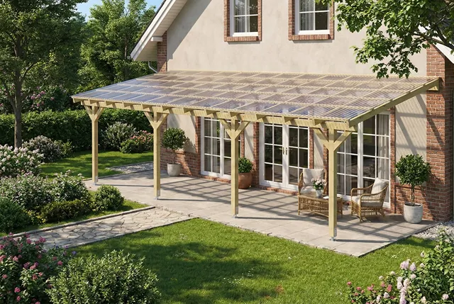 Unsere Pergola ist die ideale Lösung, wenn Sie ein stabiles und elegantes Terrassendach suchen. Am besten eignet sich eine Überdachung aus transparenten Stegplatten (Polycarbonat), Sie können jedoch auch beliebige Well- oder Trapezplatten verwenden – ganz nach Ihrem Geschmack.