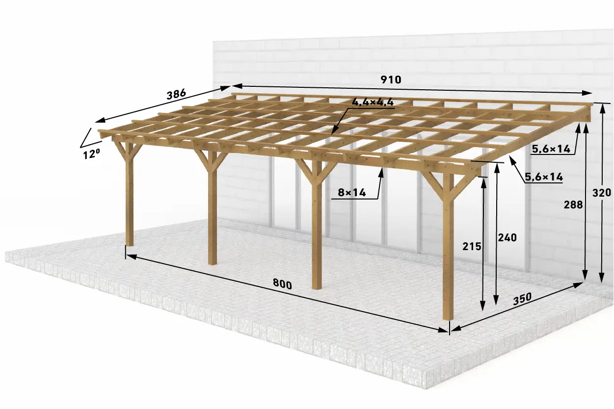 | Zusätzliche Maße | ● Sparren: 5,6x14 cm (BSH) ● Pfette (Mauerlatte): 8x14 cm (BSH) ● Dachlatten: 4,4x4,4 cm |