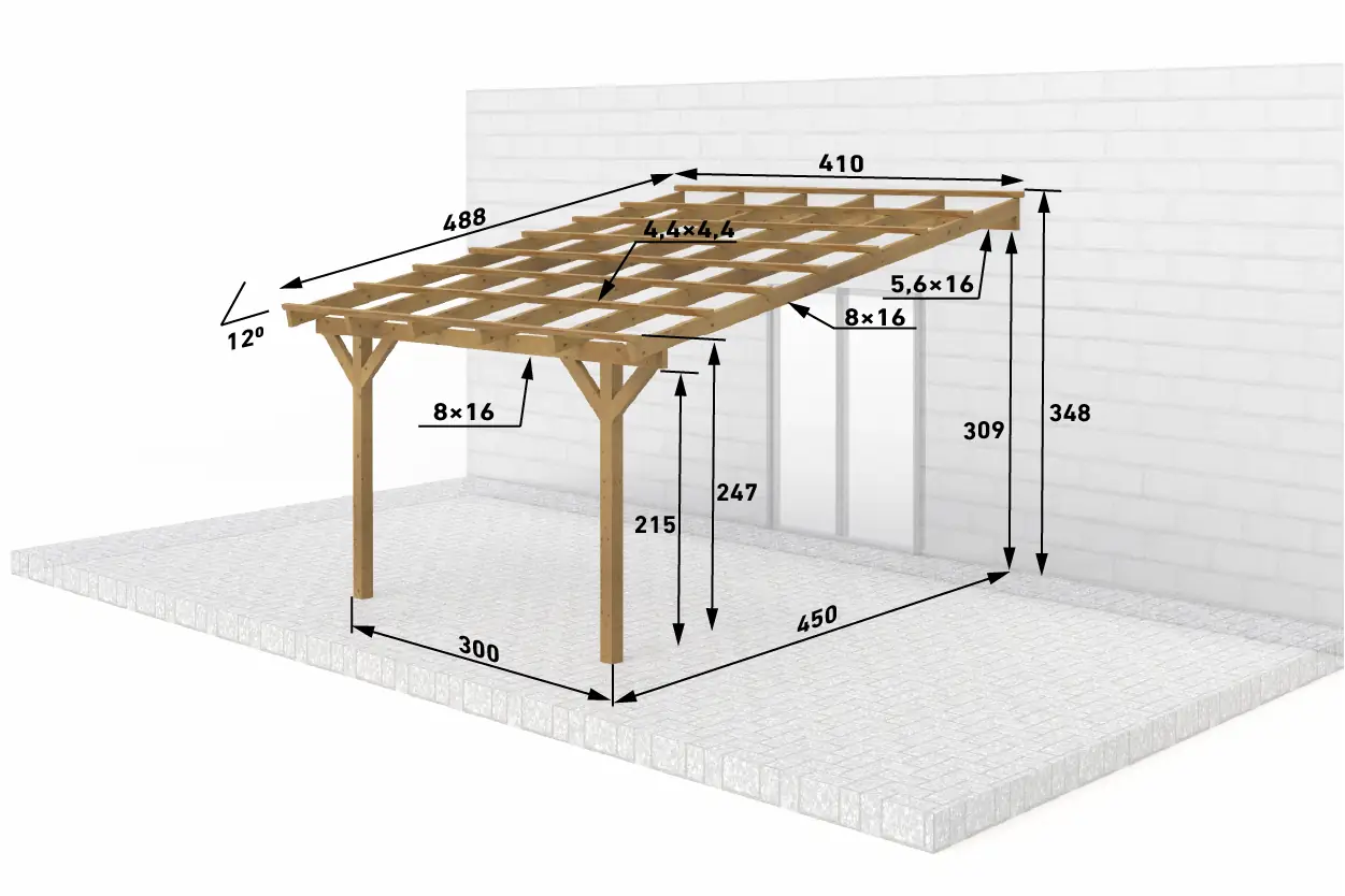| Zusätzliche Maße | ● Sparren: 8x16 cm (BSH) ● Pfette (Mauerlatte): 8x16 cm (BSH) ● Dachlatten: 4,4x4,4 cm |