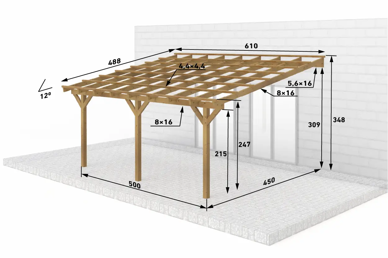 | Zusätzliche Maße | ● Sparren: 8x16 cm (BSH) ● Pfette (Mauerlatte): 8x16 cm (BSH) ● Dachlatten: 4,4x4,4 cm |