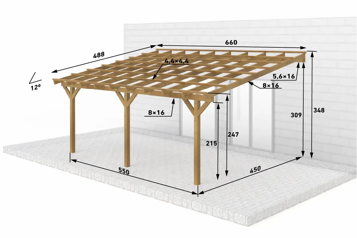 | Zusätzliche Maße | ● Sparren: 8x16 cm (BSH) ● Pfette (Mauerlatte): 8x16 cm (BSH) ● Dachlatten: 4,4x4,4 cm |