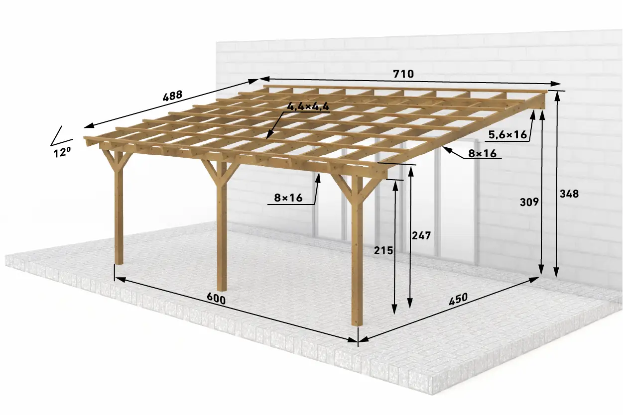 | Zusätzliche Maße | ● Sparren: 8x16 cm (BSH) ● Pfette (Mauerlatte): 8x16 cm (BSH) ● Dachlatten: 4,4x4,4 cm |