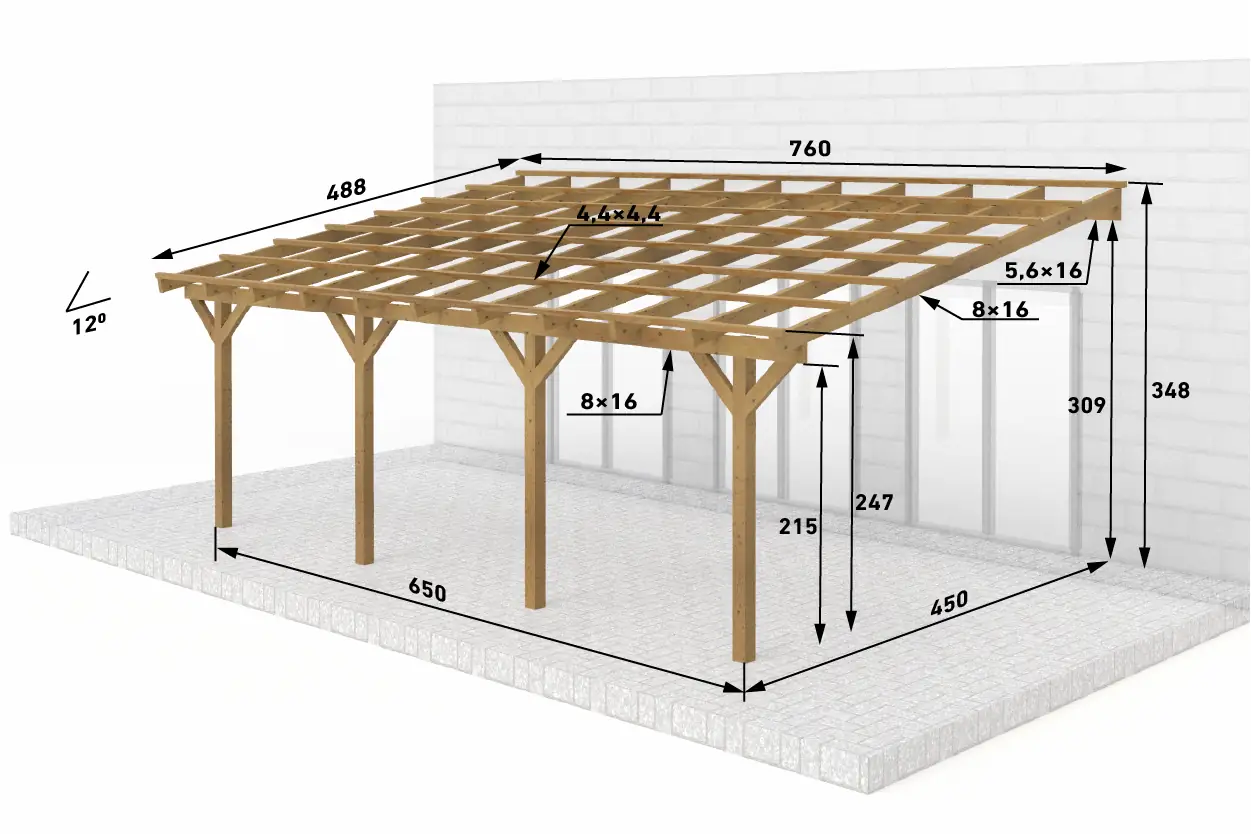 | Zusätzliche Maße | ● Sparren: 8x16 cm (BSH) ● Pfette (Mauerlatte): 8x16 cm (BSH) ● Dachlatten: 4,4x4,4 cm |