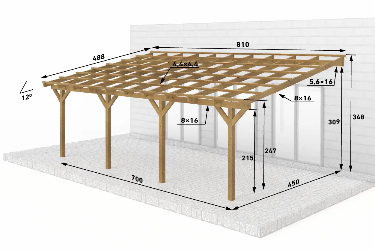 | Zusätzliche Maße | ● Sparren: 8x16 cm (BSH) ● Pfette (Mauerlatte): 8x16 cm (BSH) ● Dachlatten: 4,4x4,4 cm |