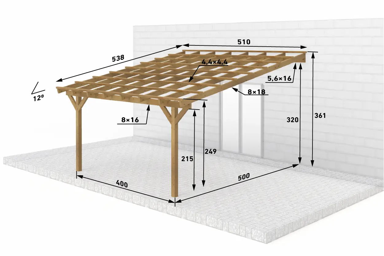 | Zusätzliche Maße | ● Sparren: 8x18 cm (BSH) ● Pfette (Mauerlatte): 8x16 cm (BSH) ● Dachlatten: 4,4x4,4 cm |