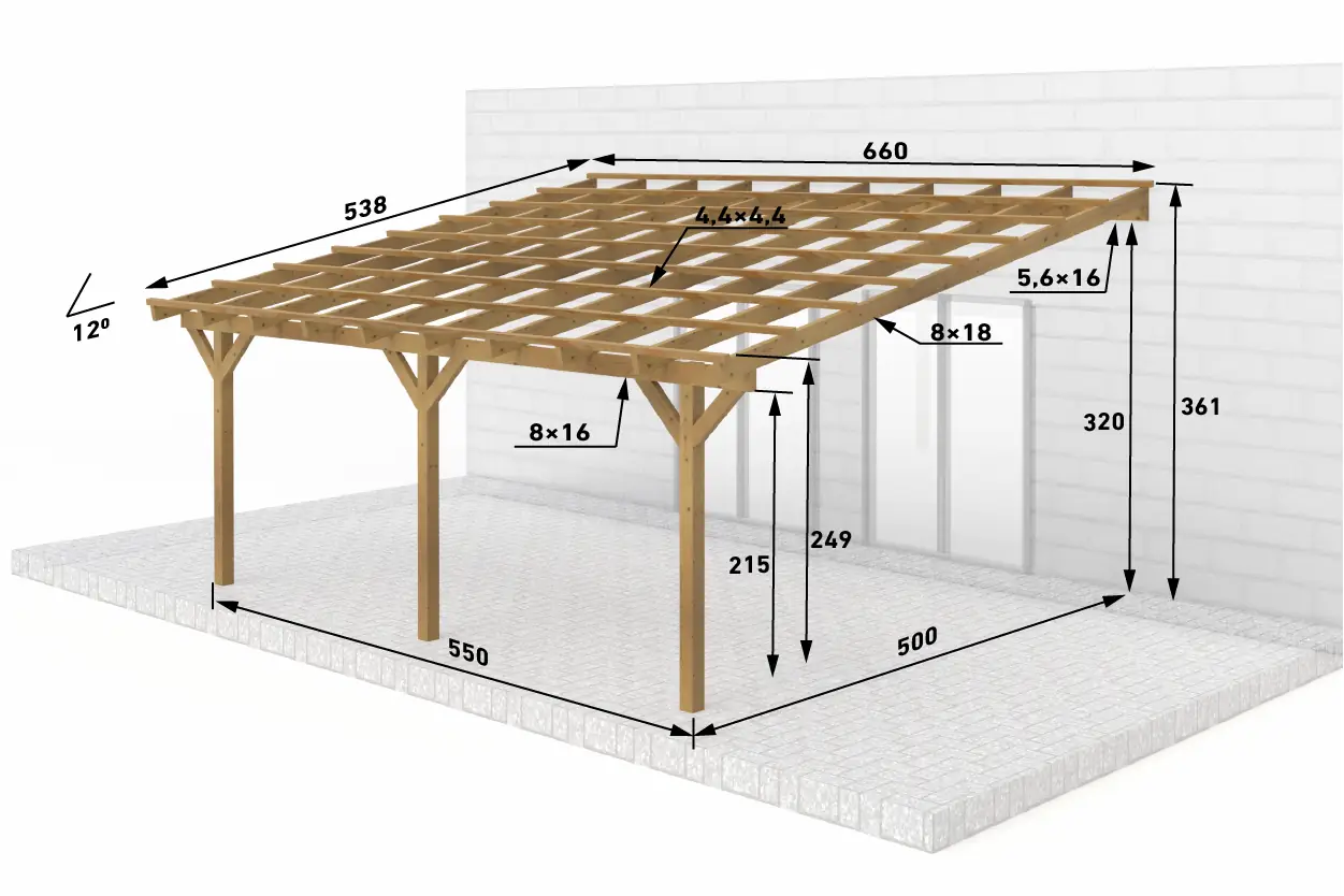 | Zusätzliche Maße | ● Sparren: 8x18 cm (BSH) ● Pfette (Mauerlatte): 8x16 cm (BSH) ● Dachlatten: 4,4x4,4 cm |